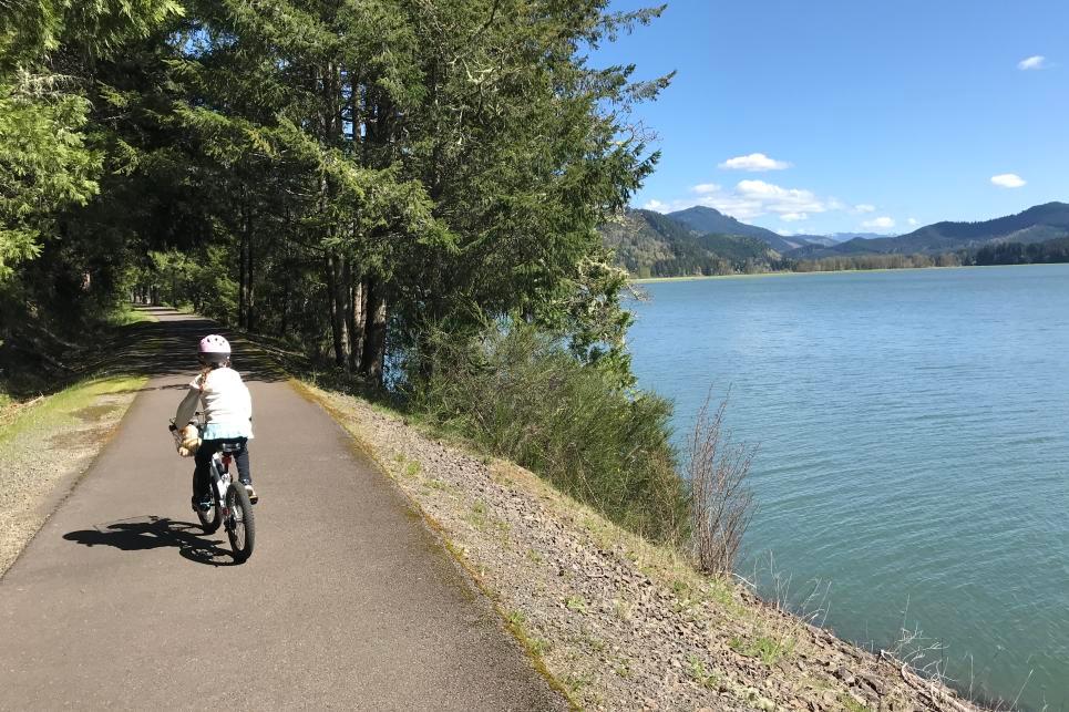 The Row River Trail is a beautiful trail alongside Dorena Reservoir. It is a great trail for older and experienced cyclists because it is 15 miles long and has a slight incline in places. However, if you plan out your turn-around, it is always great for younger families because it has long flat stretches and is mostly buffered from traffic. There are just a few road crossings and the biggest have been enhanced with pedestrian-crossing safety features like flashing lights.