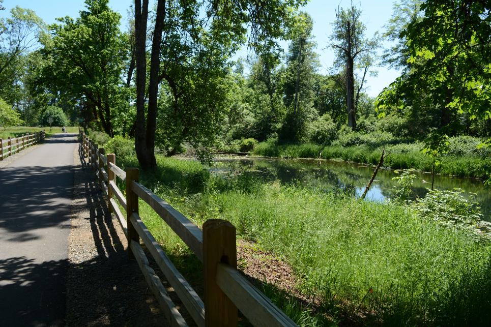 The Mill Race Path is a pleasant ride that parallels the Springfield Mill Race, a constructed waterway from the 1800s. Its three miles course through wetlands which makes it an interesting journey for children eager to spot wildlife from nutria to frogs to ducks. There are also industrial views of factories and the older Booth-Kelly buildings. The Mill Race connects downtown Springfield to the Middle Fork Path (Clearwater Park) for a larger seven-mile stretch. There are restrooms and a picnic area at the Booth-Kelly trailhead.